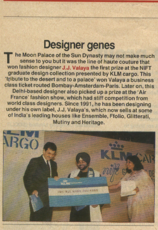 In 1991, JJ Valaya wins the Elyxa award and the Thapar-DuPont medal at the NIFT graduation show, New Delhi for the most innovative use of fabric.